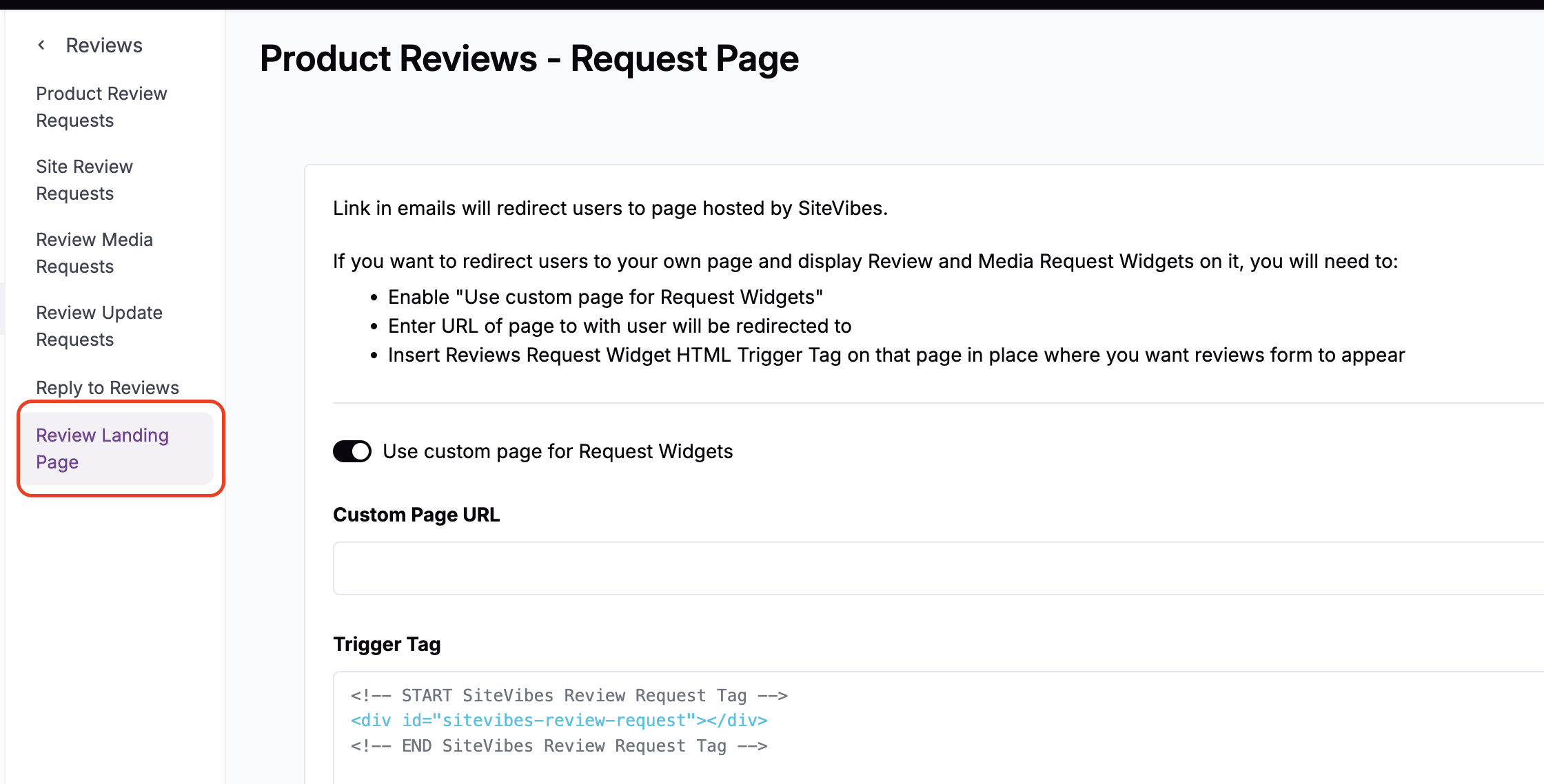 <!-- END SiteVibes Review Request Tag -->In SiteVibes and the Reviews Page, Add the full URL in the 'Custom Page URL'
